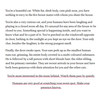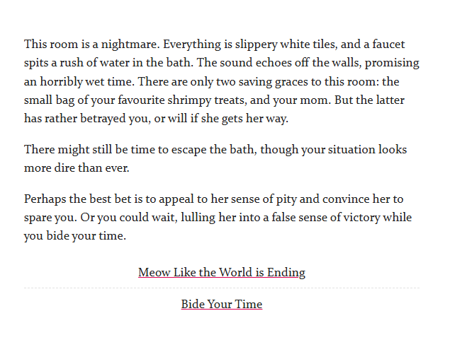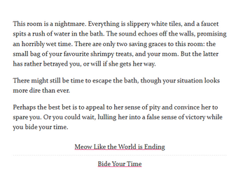 I wrote this to learn my way around Twine and see whether I enjoyed writing interactive fiction (I do!). Have fun trying to escape the bath, and see how many treats you can receive!